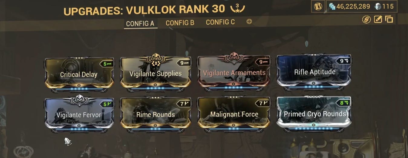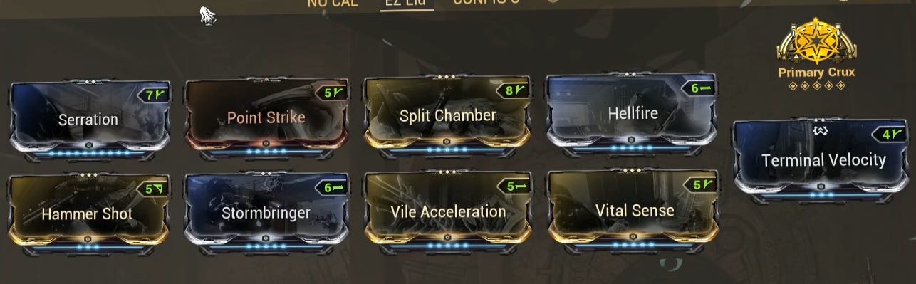 This is the build. As you can see, no fancy Galvanized mods or anything like that because those require us to ramp up the kills. For the Tridolon runs, we need the big, hard numbers right away. There's no room to ramp up.