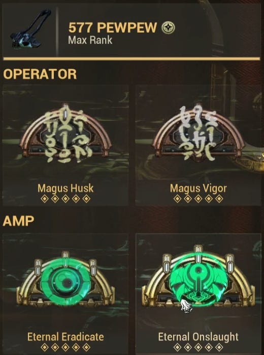 For the amp arcanes, I use Eternal Eradicate for 60% additional Damage on Operator Abilities and Eternal Onslaight for 180 % Crit Chance when my energy is depleted. You can substitute one of these with Virtuous Strike but this is the build I recommend.