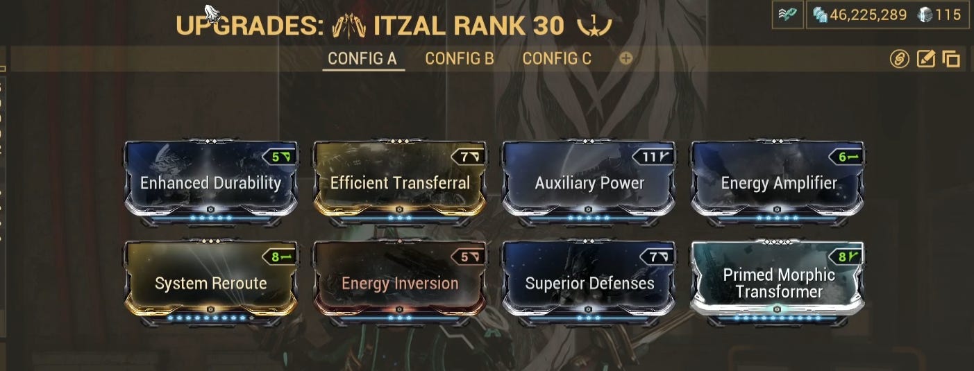 For the vehicles, I use the Itzal. We're using this because of the third ability which sucks up all the items within the area of effect. The build doesn't really matter because we're just using it for its third skill but I'll show you my build anyway.