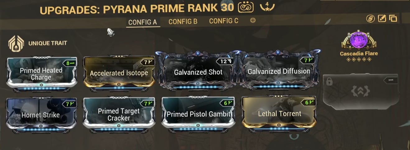 For the secondary, I'm using a Pyrana Prime but any high fire rate secondary will do. The main purpose of the secondary is to get Lures and break Voms. Because of that, the build isn't really important but if you wanna see it, here you go.