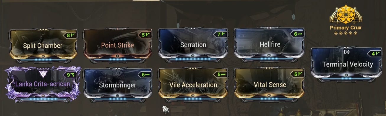 For the Arcane, I'm using Crux mainly for Ammo Efficiency and the Exilus slot has a Terminal velocity because Lanka is a projectile weapon.