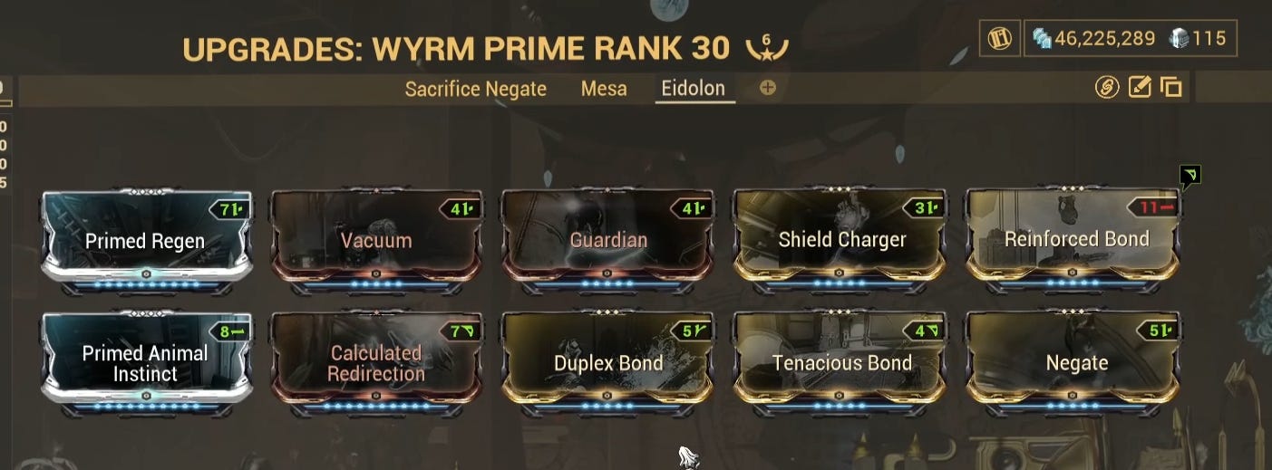 For the companion, I have a Wyrm built for fire rate buffing. I slotted a Calculated Redirection to proc reinforced bond because, again, fire rate is important because we're using a charge weapon. I use tenacious bond as well for more crit damage. This only procs when the companion's CC is over 50 percent so make note of that. The rest of the mods are just there for quality of life. Vacuum for resources. Guardian and Shield charger for regen and of course, Negate because why not. Duplex bond also makes an apprearance because I couldn't slot anything else there.