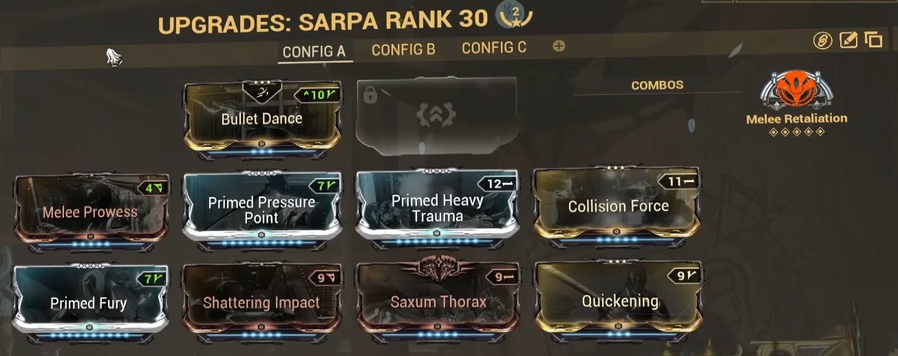 For the melee, I’m using a Sarpa. I use this to fully strip the armor of the first two Eidolons and to reduce the armor of the third one. My main mod here is Shattering impact. This is the only mod in this melee that is required. Everything else is just increasing the status weight of Impact.
